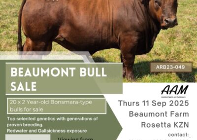 Beaumont Bull Sale Venue Beaumont Farm Date 2025/09/11 10:30:00 Field Officer Gavin Mathews 074 419 3098 gavin@aamkzn.co.za DOWNLOAD Sale listing Beaumont Bull Sale 11 Sept 2025 WhatsApp Image 2025-08-28 at 16.18.11 September 11 @ 10:30 am - 5:00 pm Beaumont Farm, -29.30440120240733, 29.929681418753834